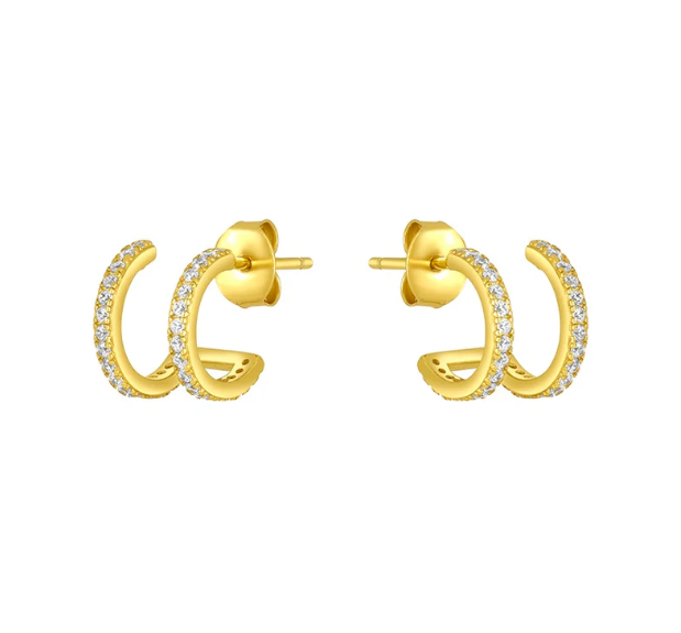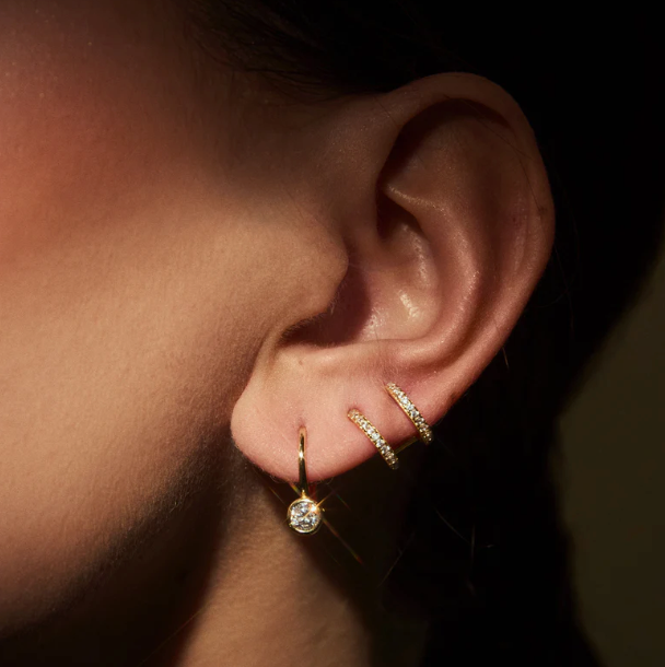 18k gold plated 925 sterling silver, 3A CZ, 10mm Diameter, 8mm Width. Hypoallergenic.