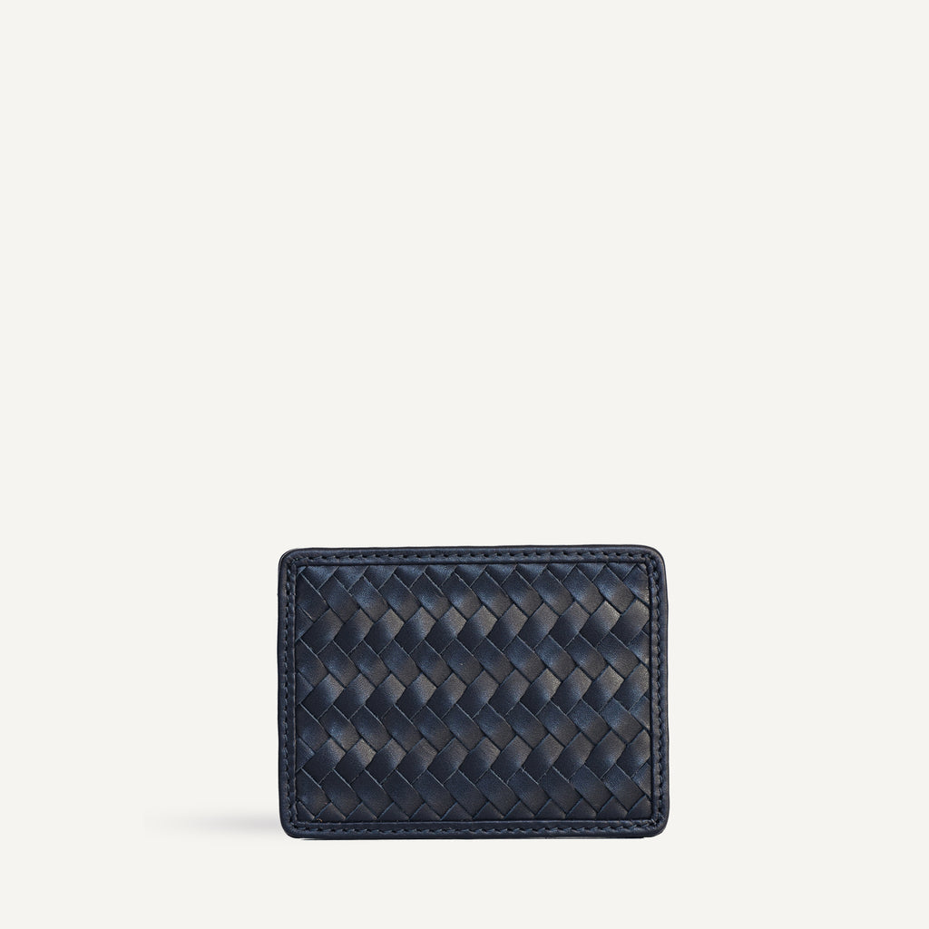 A slim, minimalist card case to hold your essentials. Made in handwoven leather and features two card slots and a pocket for loose bills.