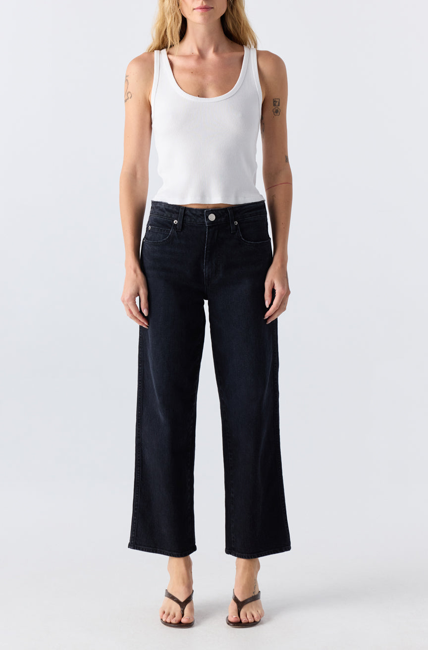 This cropped, wide straight leg is our easiest fit yet. Cut from premium vintage stretch denim with a mid rise, this pair is meant to sit low on the hips for a relaxed look. Thoughtful distressing throughout. Zip fly.