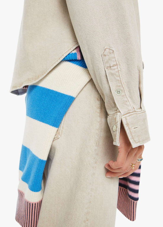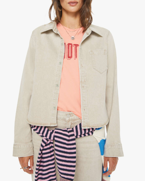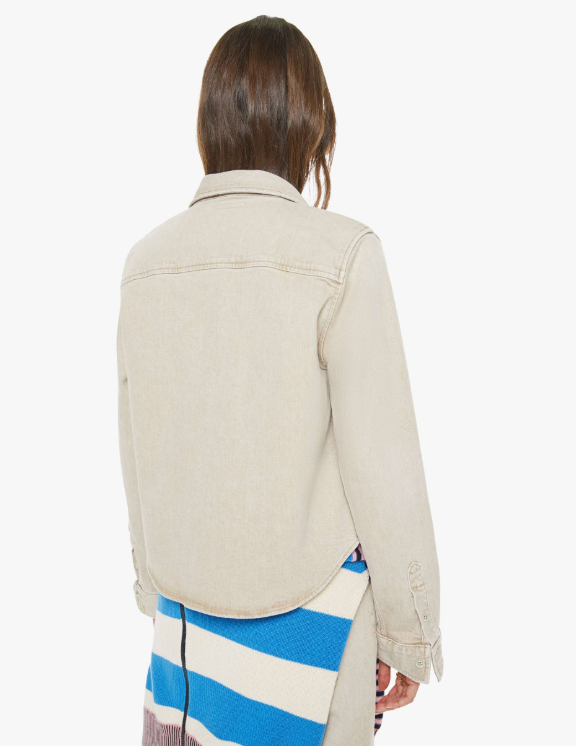 A button-up denim top with a front patch pocket and a curved, cropped hem. Made from semi-rigid SUPERIOR denim, Caramel is a faded khaki with tan stitching and shell-inspired buttons.
