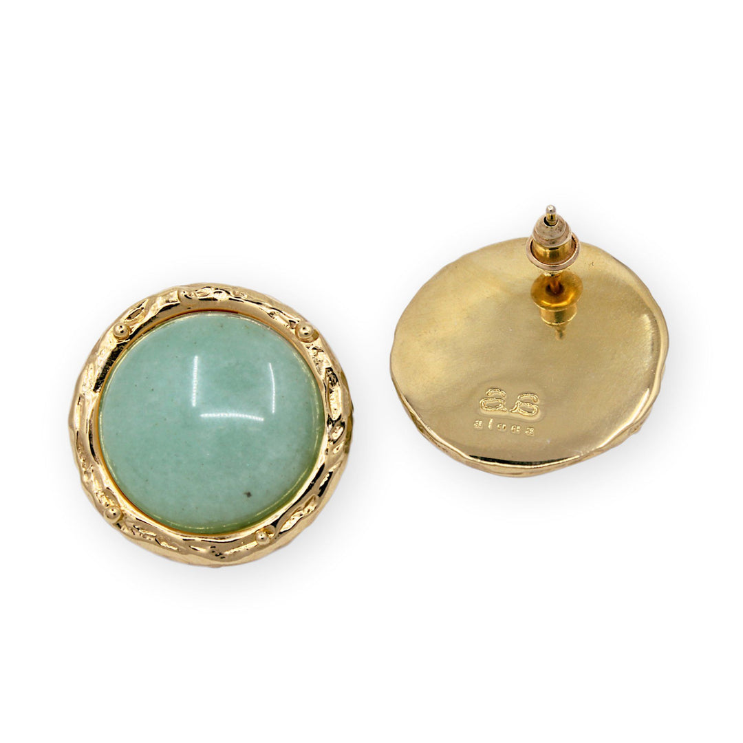 The Cindy studs feature a 18kt gold plated over cast bronze, textured bezel finished with a soothing Green Aventurine stone. Please note each stone will slightly vary in their shade of green due to their natural properties.