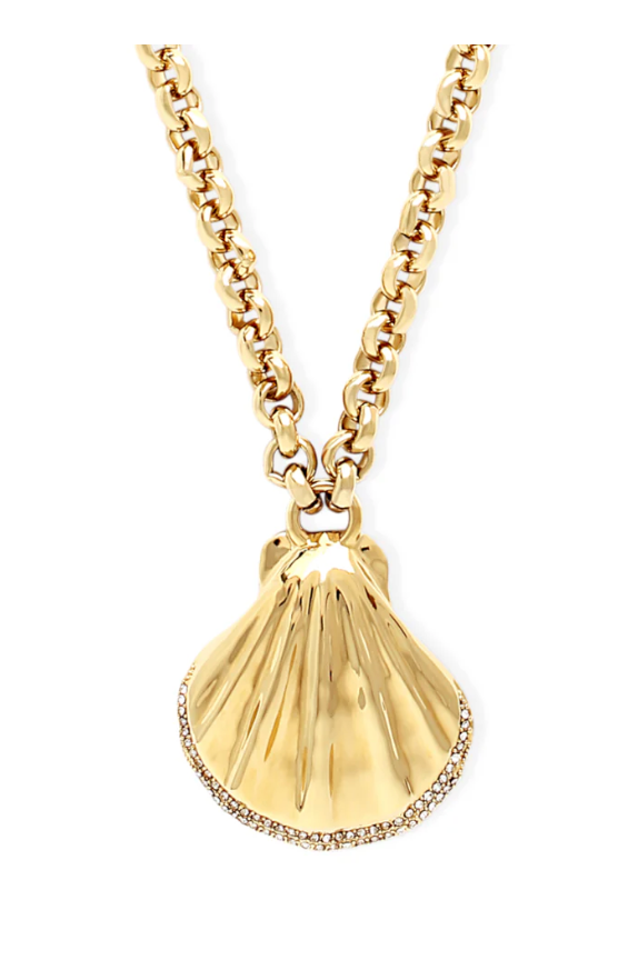 A stunning addition to your jewellery box, the Gila necklace is made with an 18k gold plated rollo chain and finished with an 18k gold plated large seashell pendant. The scalloped edge has been set with an array of cubic zirconia stones which give a dipped in diamonds finish. Perfect to be layered or worn on its own, this necklace will elevate any outfit.
