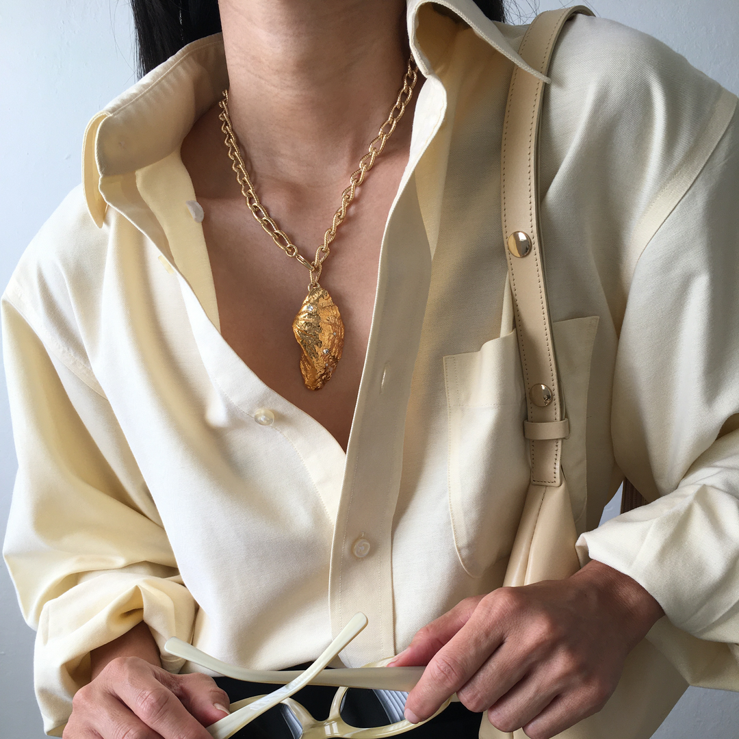 Molded from a real shell, this 18K gold-plated shell necklace features a textured oval link chain finished with an organic shell pendant finished with cubic zirconia stones and freshwater pearls. The perfect statement necklace for the summer.