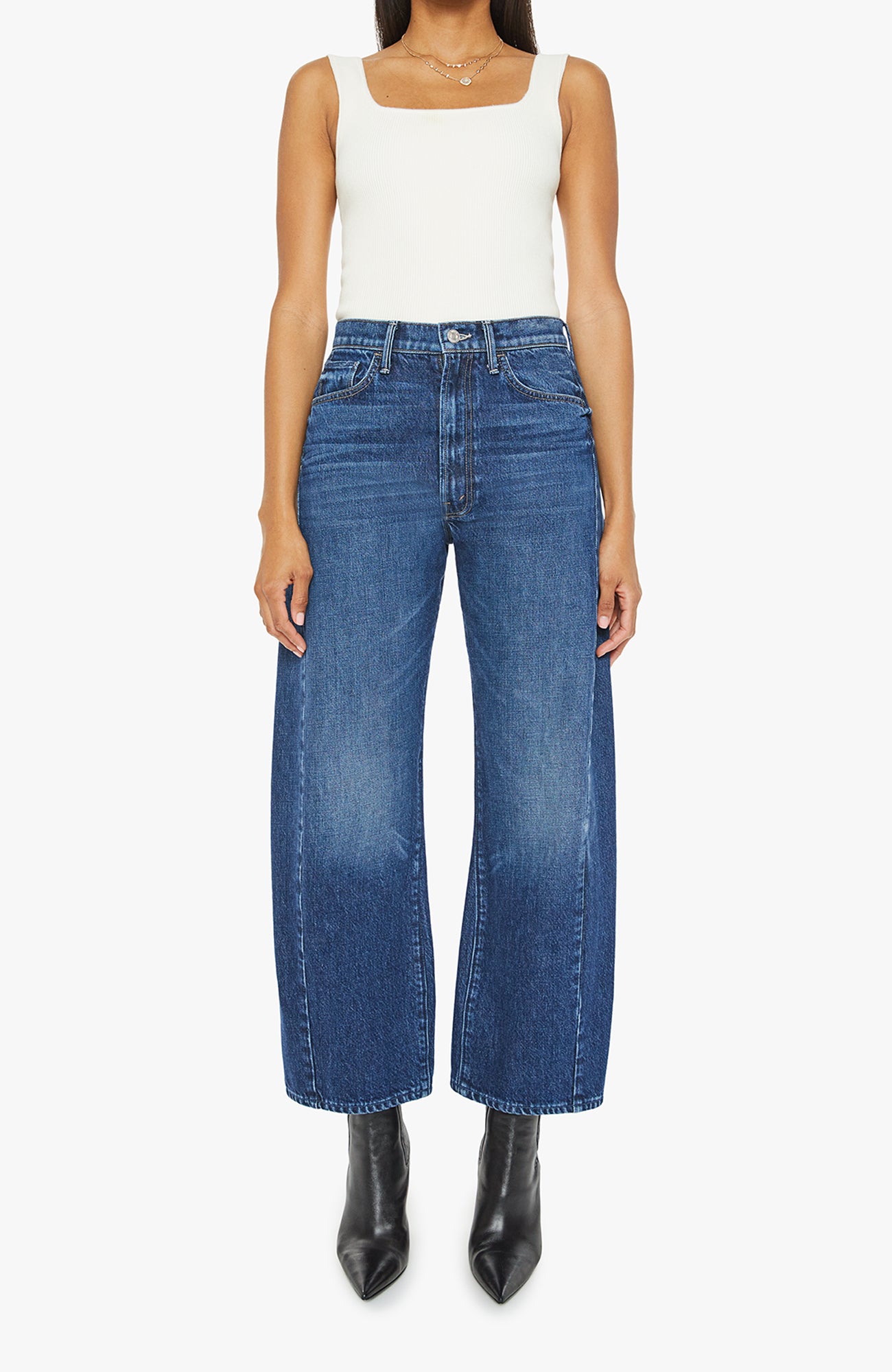 High hopes. A super high-waisted jean with a wide, curved leg, an ankle-length inseam and a clean hem. Made from SUPERIOR denim, Did You Bring Me Anything? is a dark blue wash with whiskering and fading at the knees.