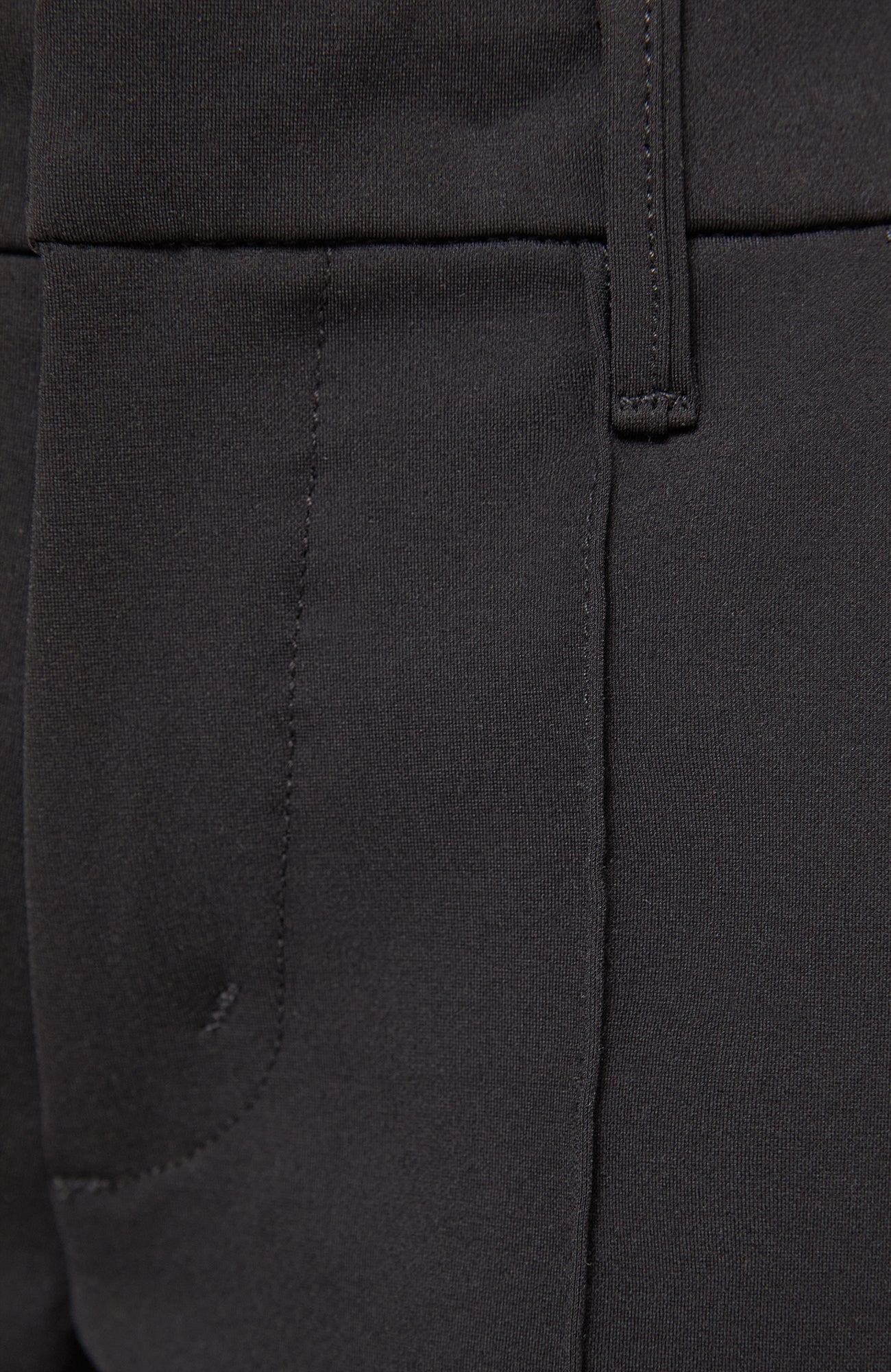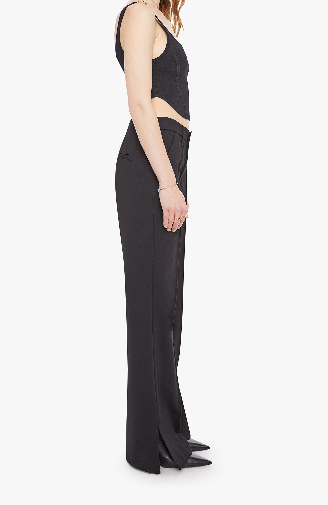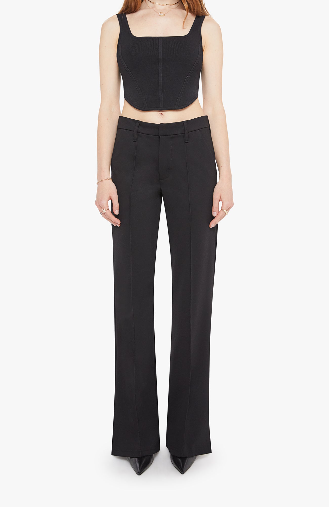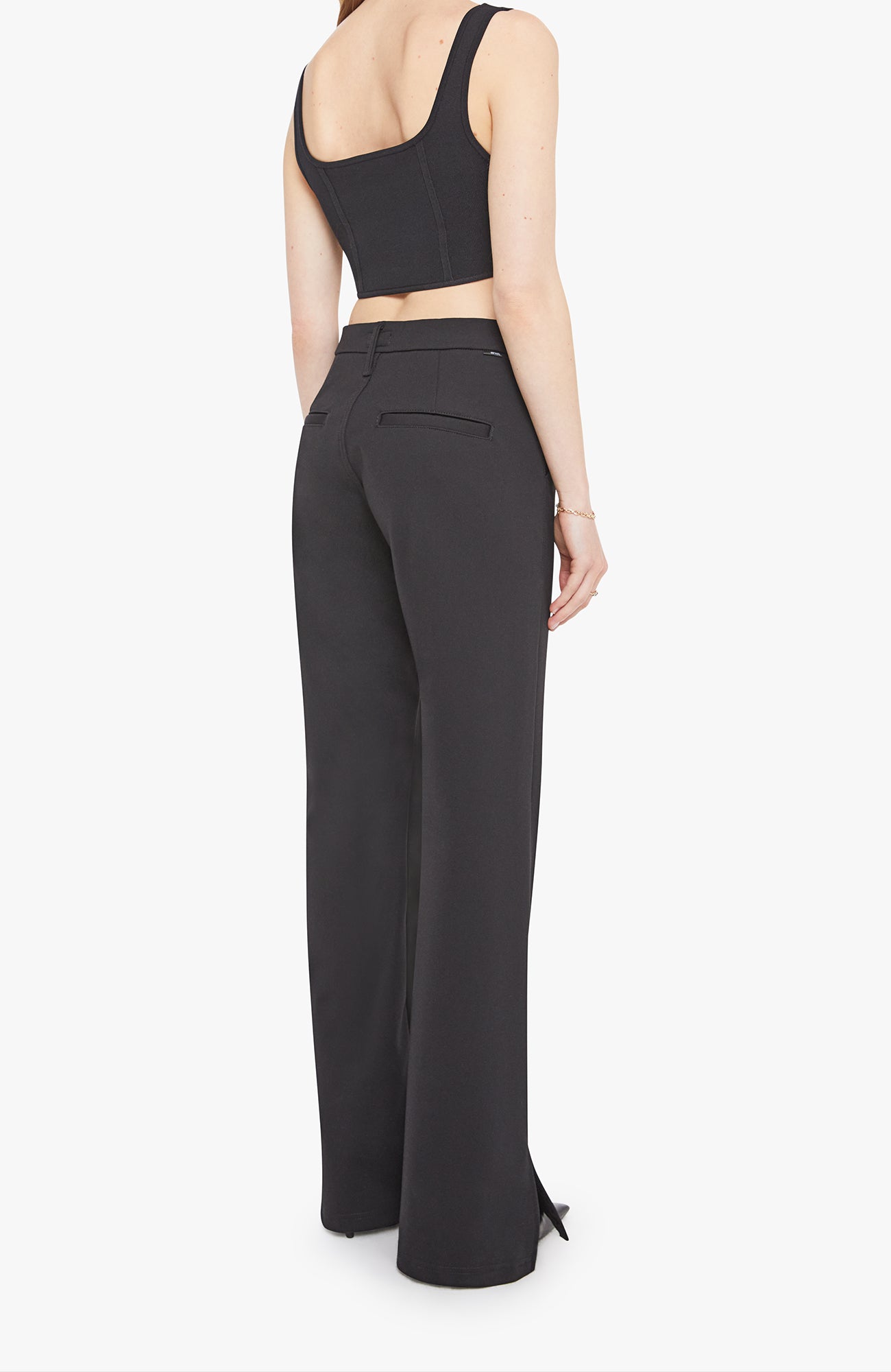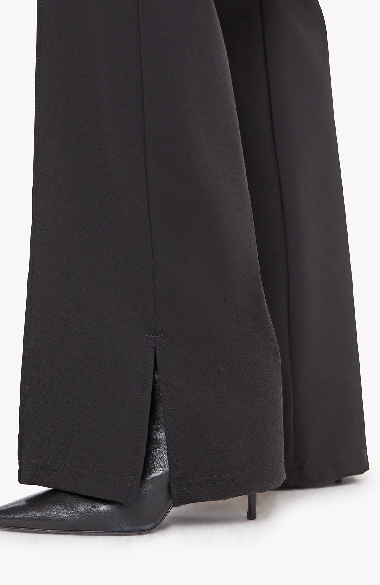 A high-rise bootcut trouser with a zip fly, looser leg, pintuck details down the front, a long 34-inch inseam and a slit hem. Made from stretch fabric, the pants are designed in black with tonal hardware.