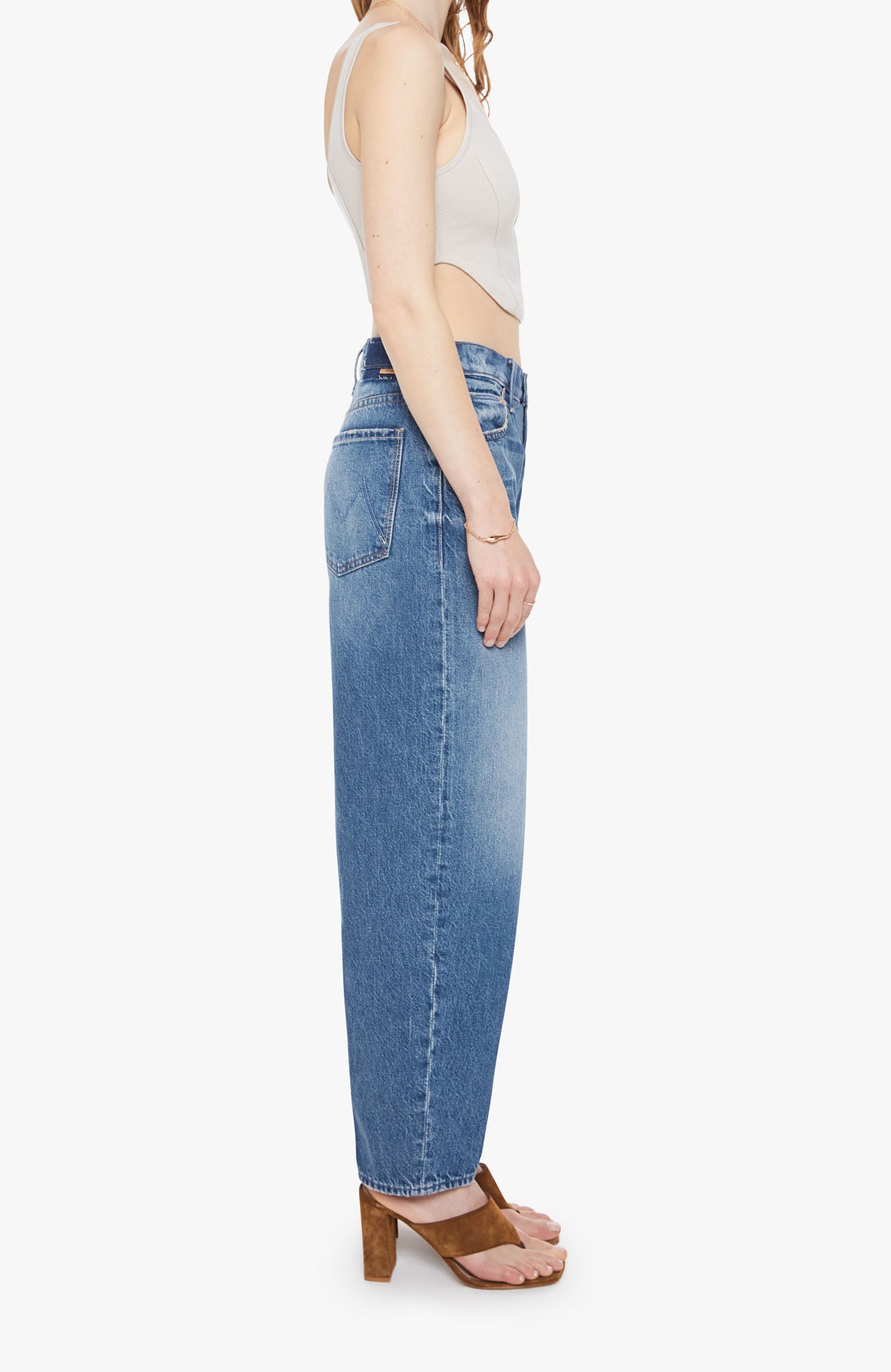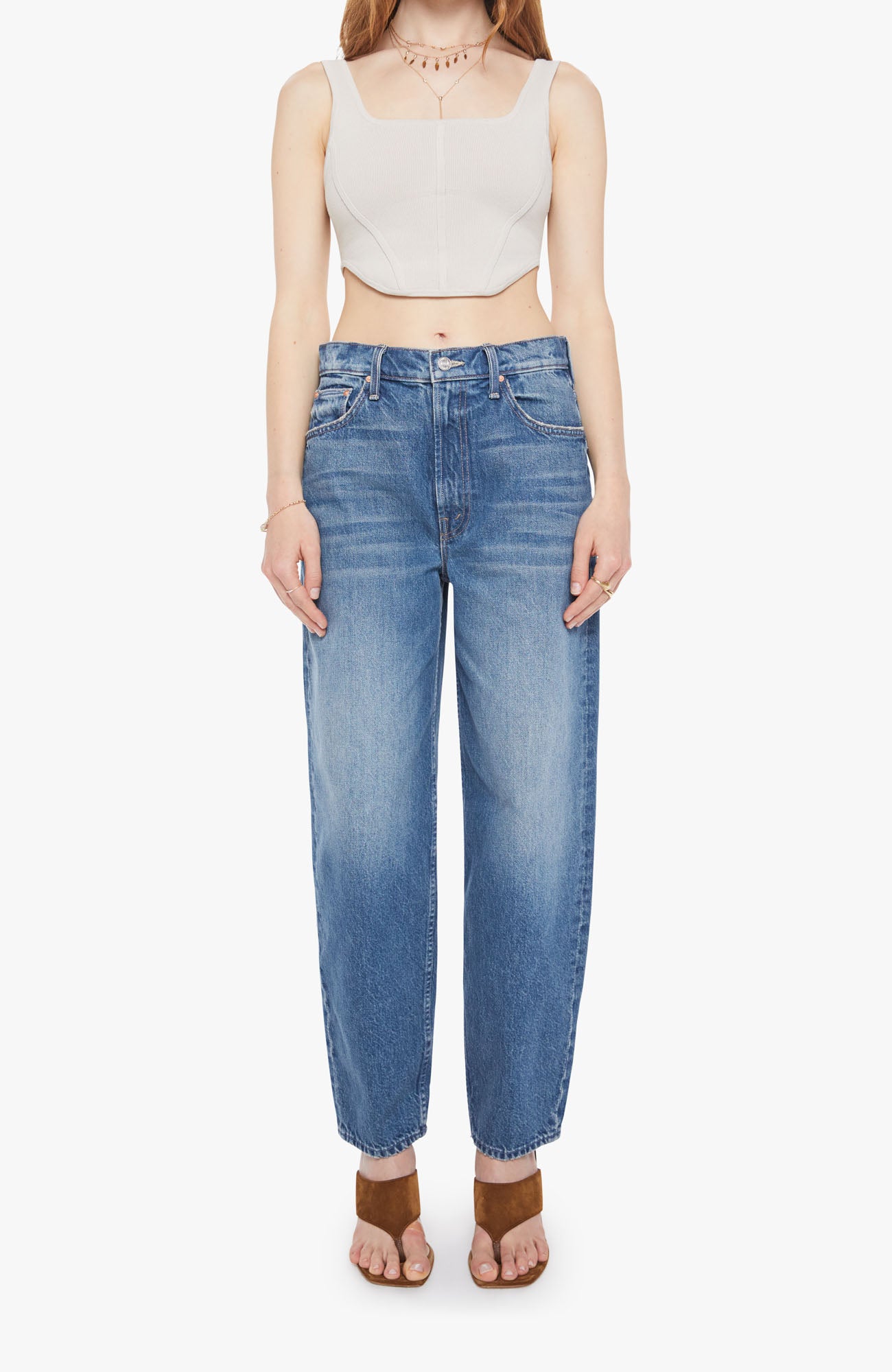 A blast from the past. Super high-waisted barrel-leg jeans with a zip fly, ankle-length inseam and a clean hem. Made from rigid SUPERIOR denim, Remember When is a mid-blue with whiskering and fading at the knees.