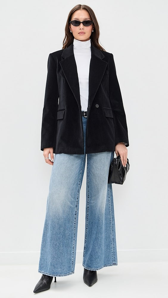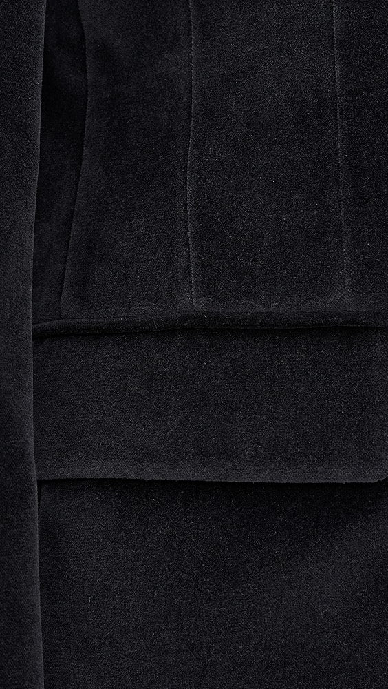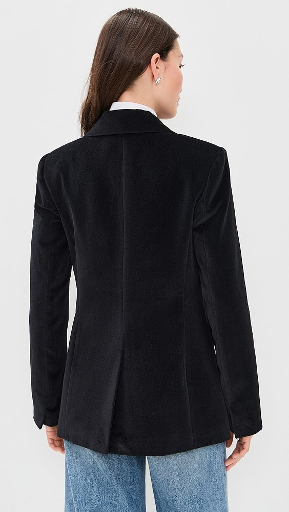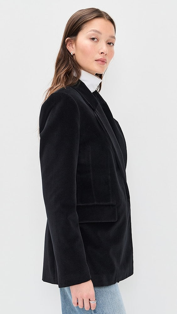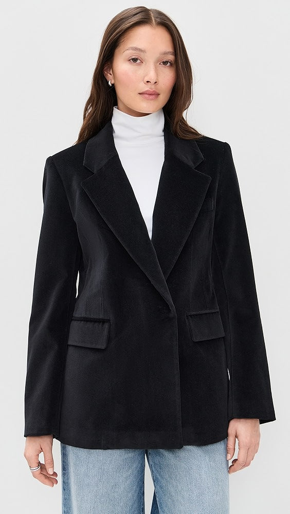The ‘Matteau’ is a sharply tailored essential, crafted from ultra-soft polished velvet with a refined, smooth texture. Designed with clean lines and a classic single-breasted silhouette, it offers timeless structure with a soft hand. In true black, it brings elevated ease to both day and evening looks—perfect layered over denim or styled with the coordinating pant.