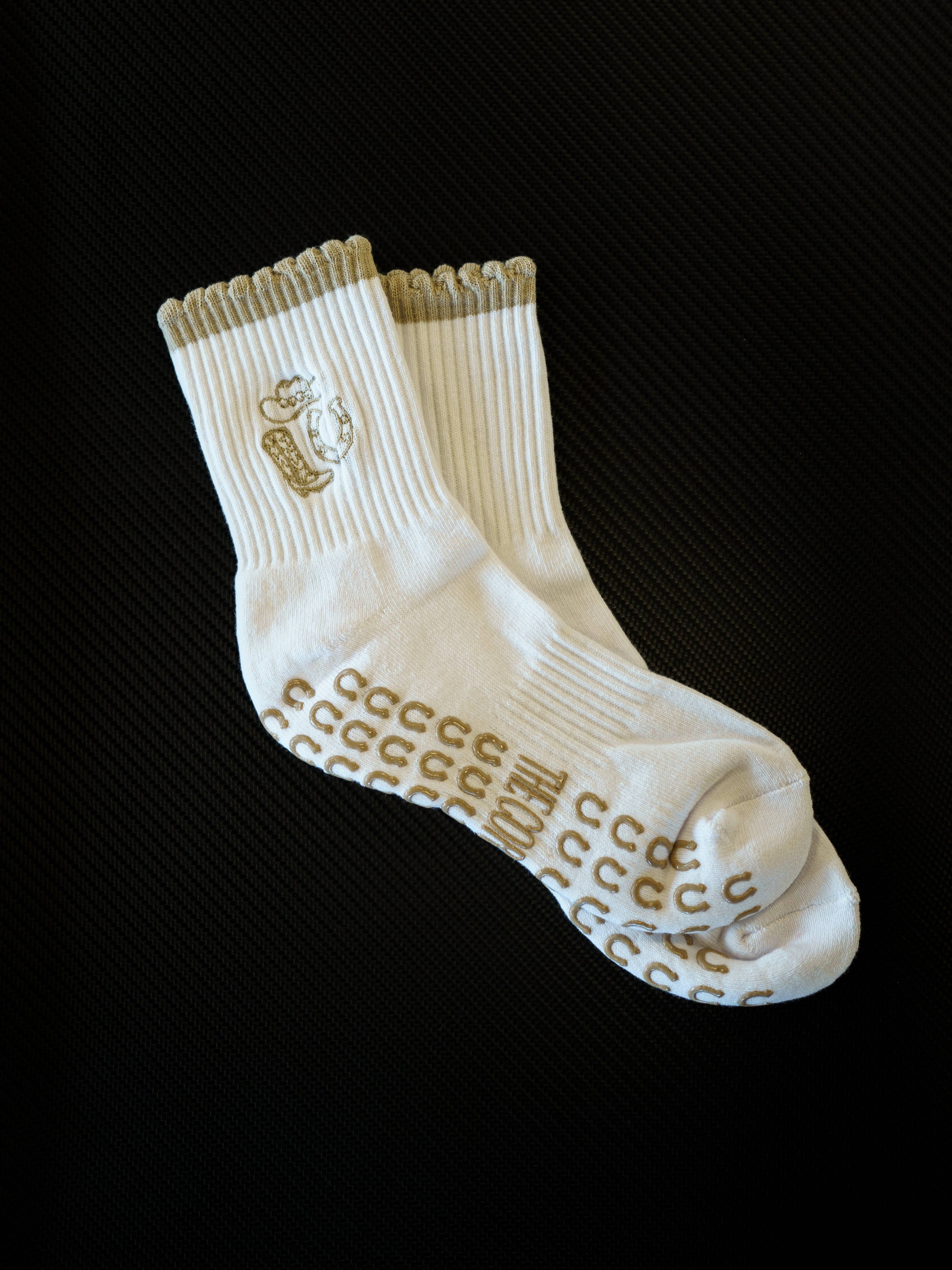 Saddle up for your next class with our TCC Tan Cowgirl Hat, Boots & Horseshoe Grippy Socks — the perfect mix of Western charm and studio-ready function. Neutral, stylish, and perfectly grippy, these socks bring a subtle cowgirl flair to every move.