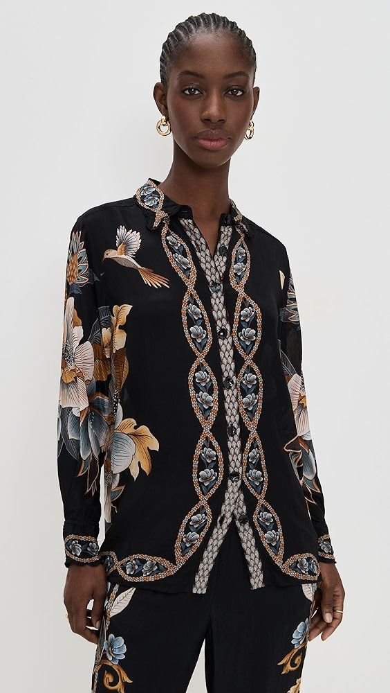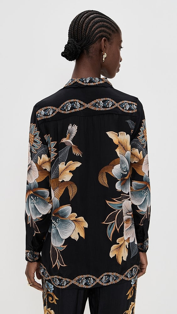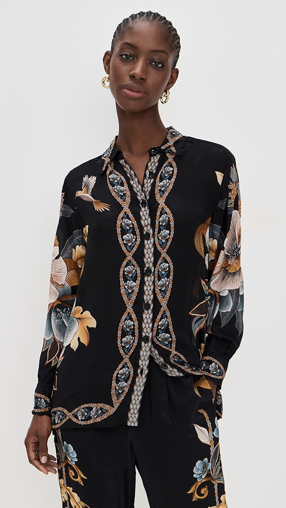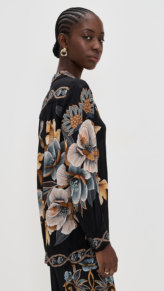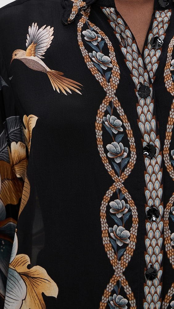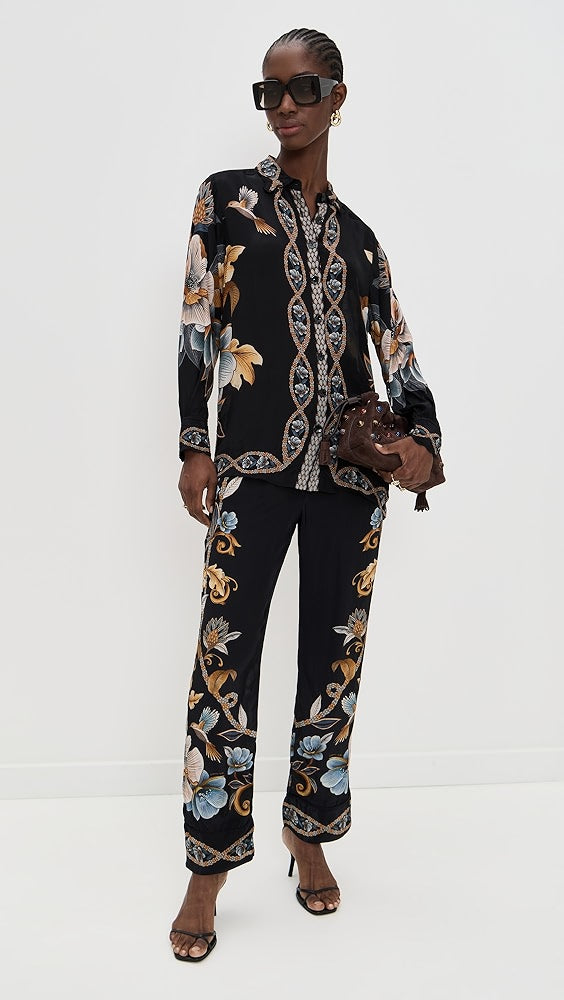 Embrace an elegant ease with the Black Floral Snake Pajama Shirt, where deep black sets the stage for a captivating floral and snake motif blooming in warm ochre, soft blues, and creams. Its collar neckline gently frames embroidery that traces serpentine contours along the button placket and cuffs, infusing artisanal charm. The relaxed, fluid silhouette invites comfort while weaving a narrative of playful sophistication and intricate detail.