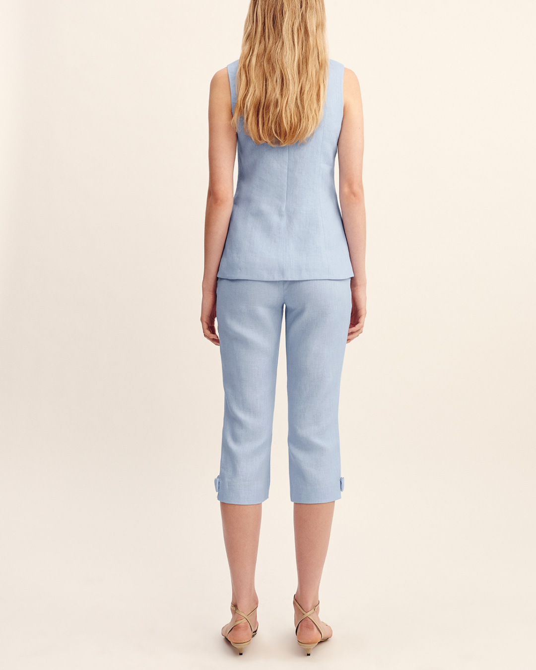 Expertly crafted for maximum style and comfort, the Harper Vest is the perfect addition to any wardrobe. Made from high-quality woven linen, this vest features a front slit and pockets adorned with charming bows. It pairs perfectly with matching capris for a flawless and fashionable look.