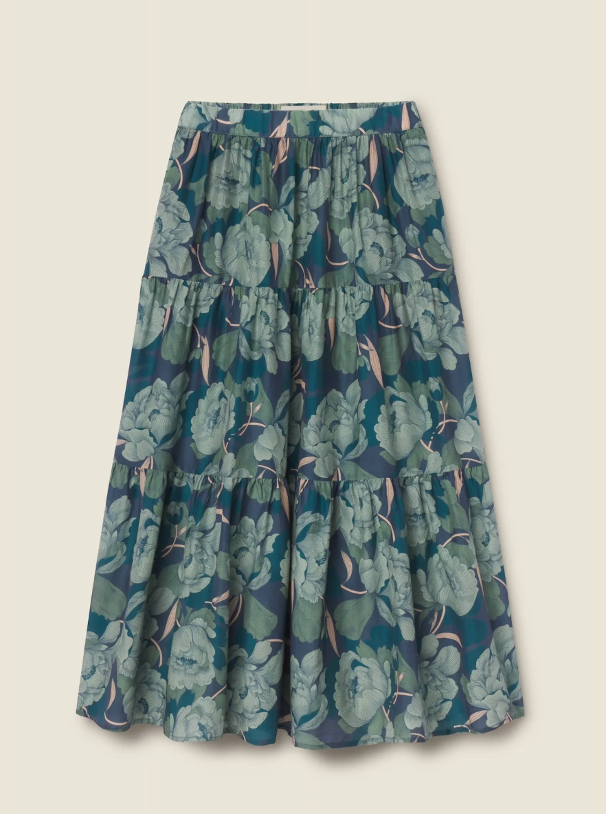 Our easy midi-length 3 tiered pull on skirt has a soft elastic waistband with matching fabric drawstring, finished with double tiered ruffle skirt. This "B" version is fulled through the midsection of the garment, for a more completed feel. Shown here in Hushed Shadow. Made from our cotton silk.
