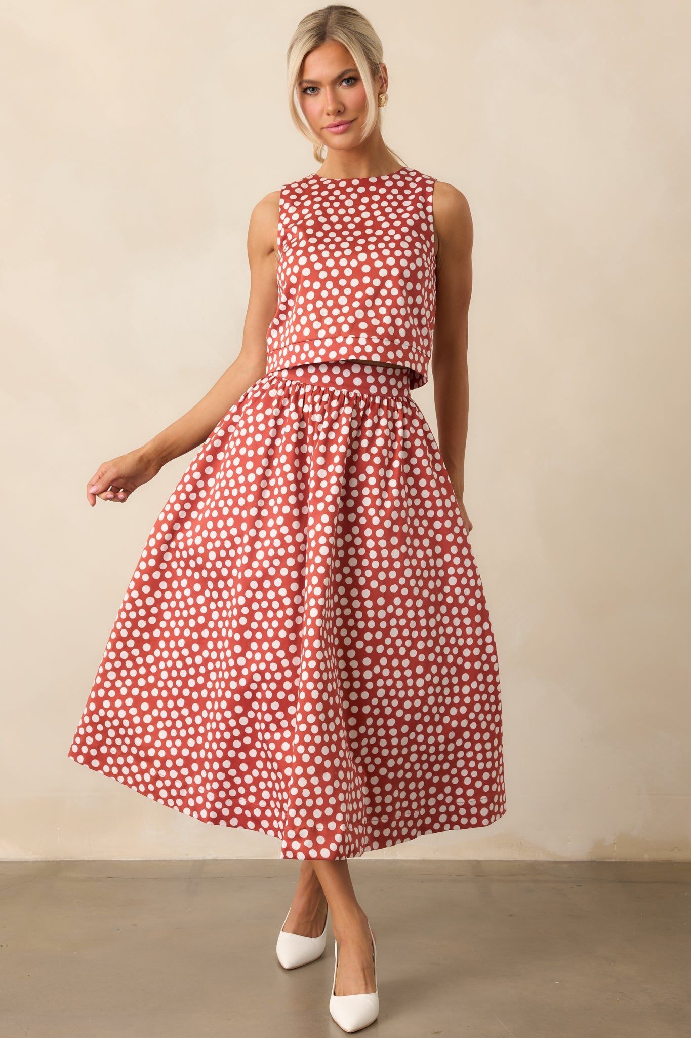 The Thena Brick Red Polka Dot Cotton Midi Skirt brings a cheerful charm, the kind of piece that makes getting dressed feel simple and a little more fun. This midi skirt features a brick red and white polka dot print, a high rise waist, an elastic back waist insert, white lining, and functional pockets.