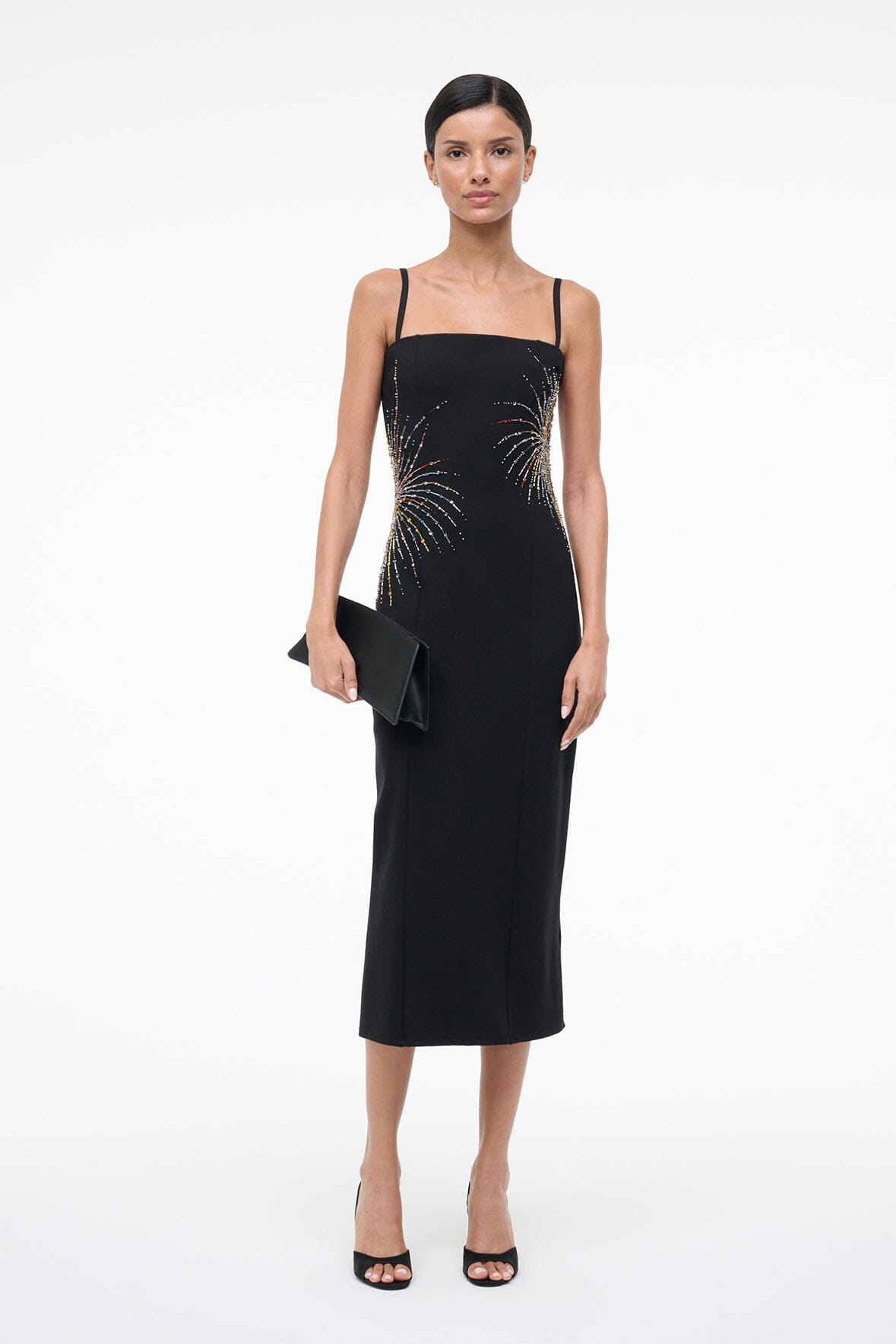 The Britney Dress is a fitted column midi dress featuring firework beading at the waist and removable straps, perfect for any holiday cocktail party.