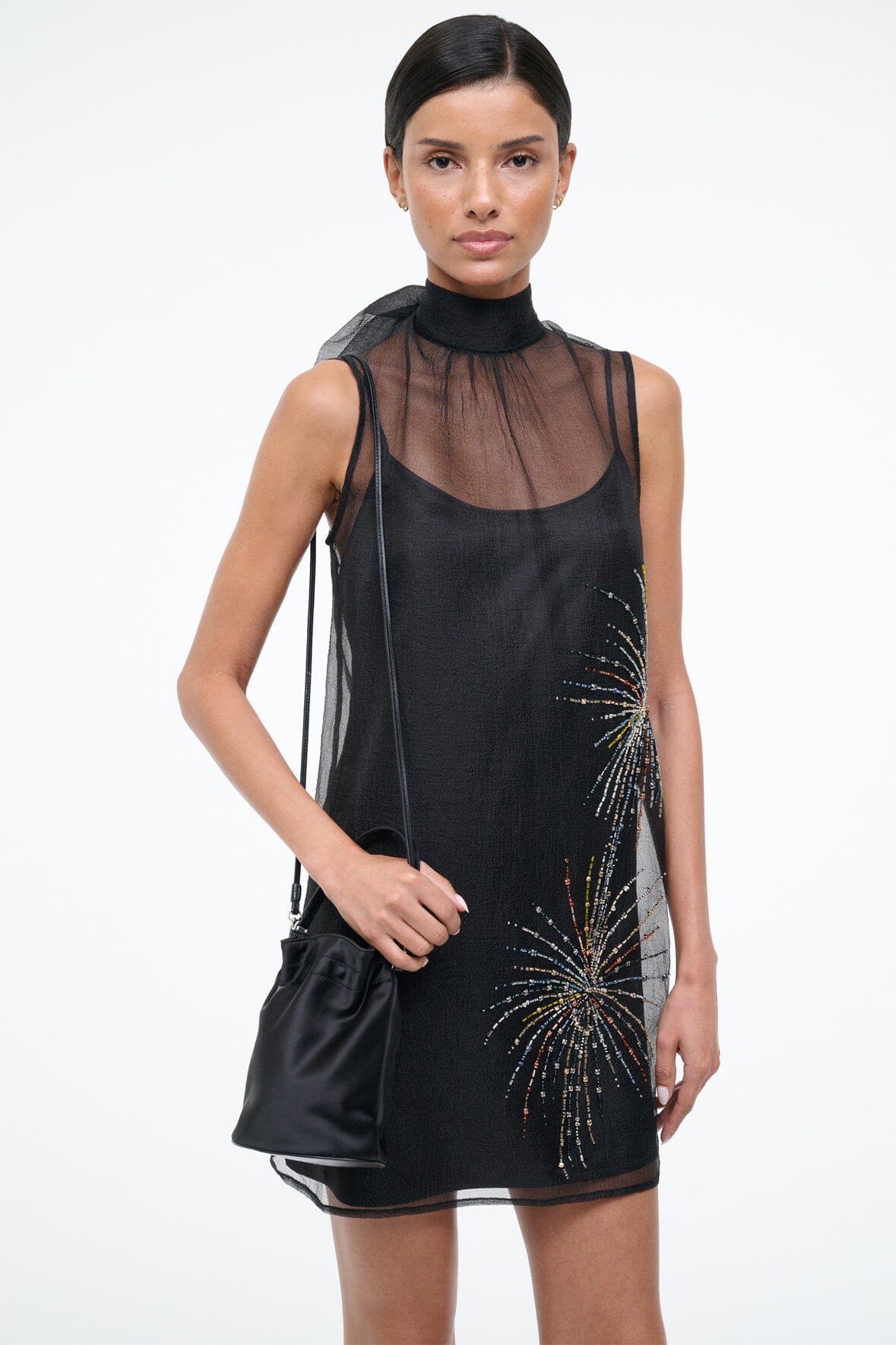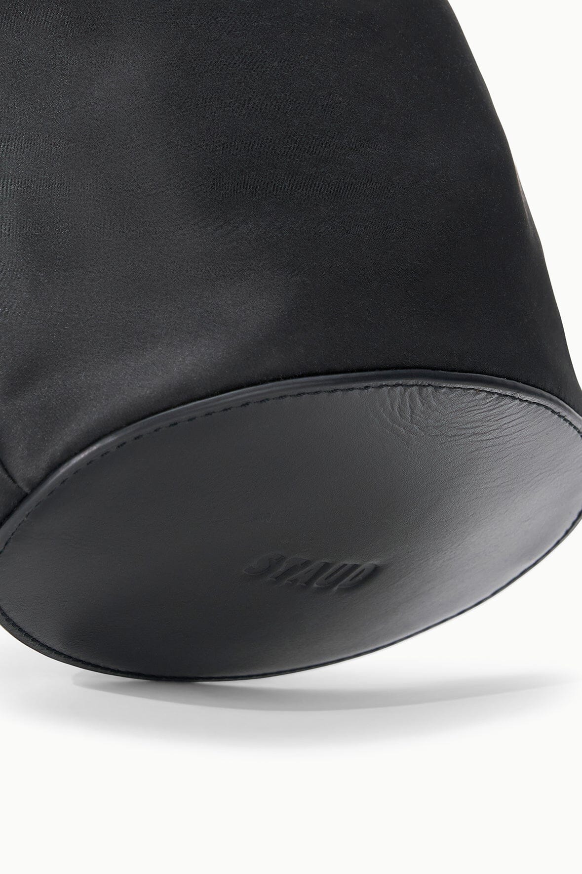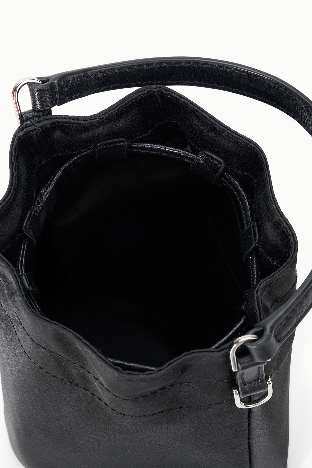 The Lila is a handheld satin evening bag with a drawstring closure. It features a detachable leather shoulder strap.