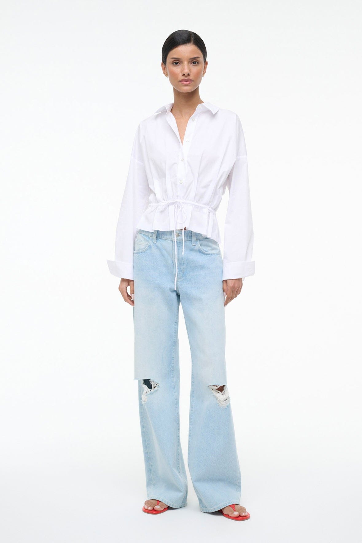 A classic white poplin button-down with unexpected details. The Primrose Shirt is crafted from a stretch poplin fabric whic keeps its crisp shape while a waisted drawstring and front tie add dimension to the classic silhouette.