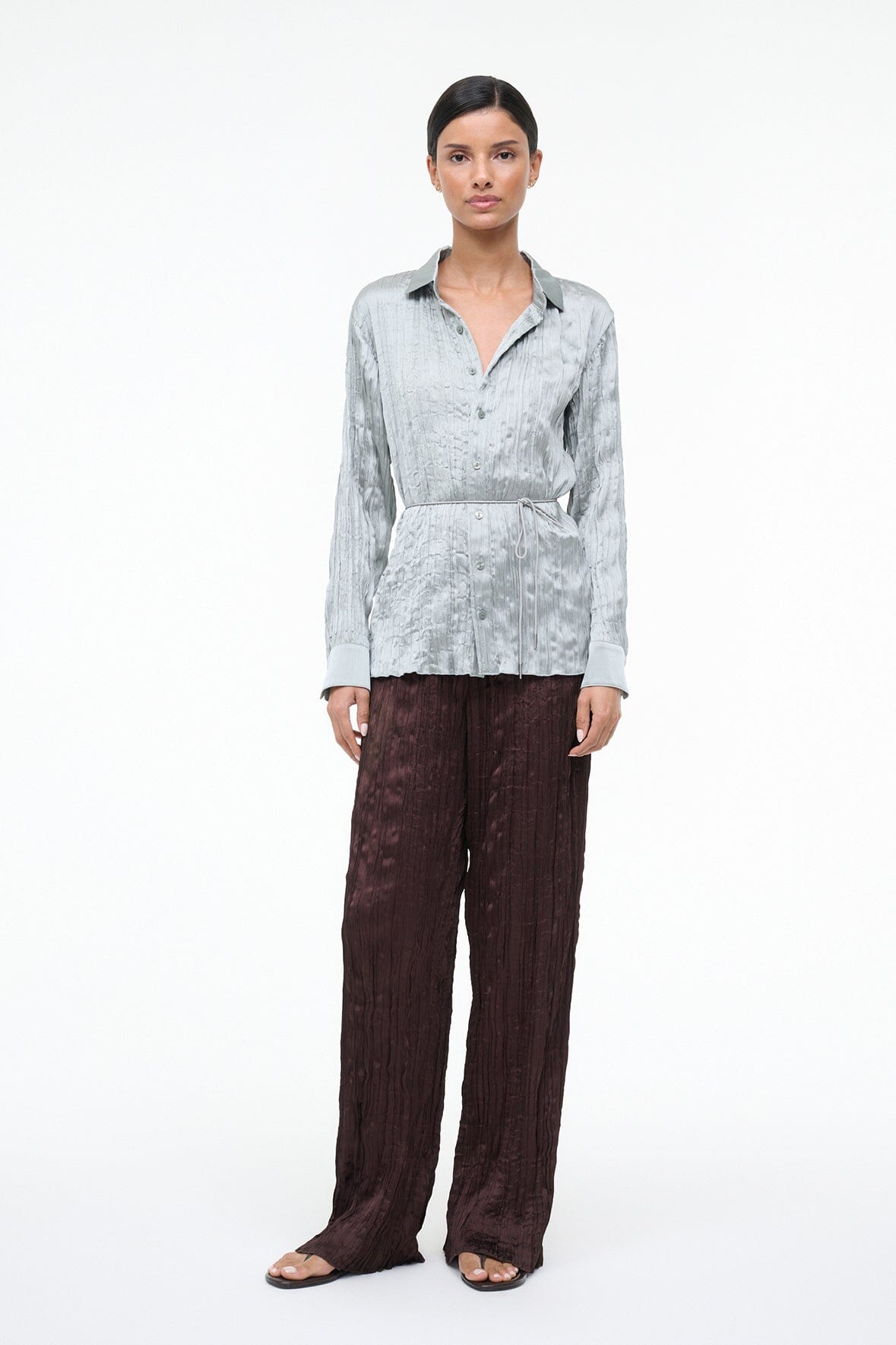 The Suki Shirt is a long sleeve collared button-up with a removable waist tie. The Suki can be paired with the Nami Pant for a matching set.