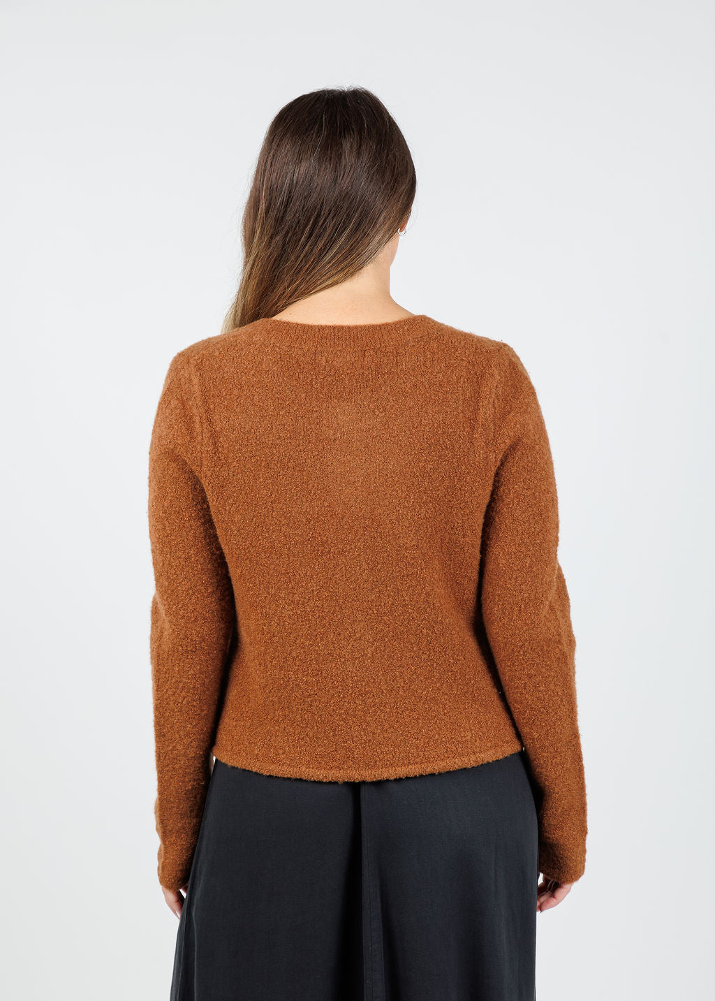 The Suncoo Galia Cardigan Sweater offers timeless elegance with a modern twist, crafted in a rich chocolate tone. Gold button closures and decorative equestrian-inspired details elevate its classic silhouette, making it a standout piece.
