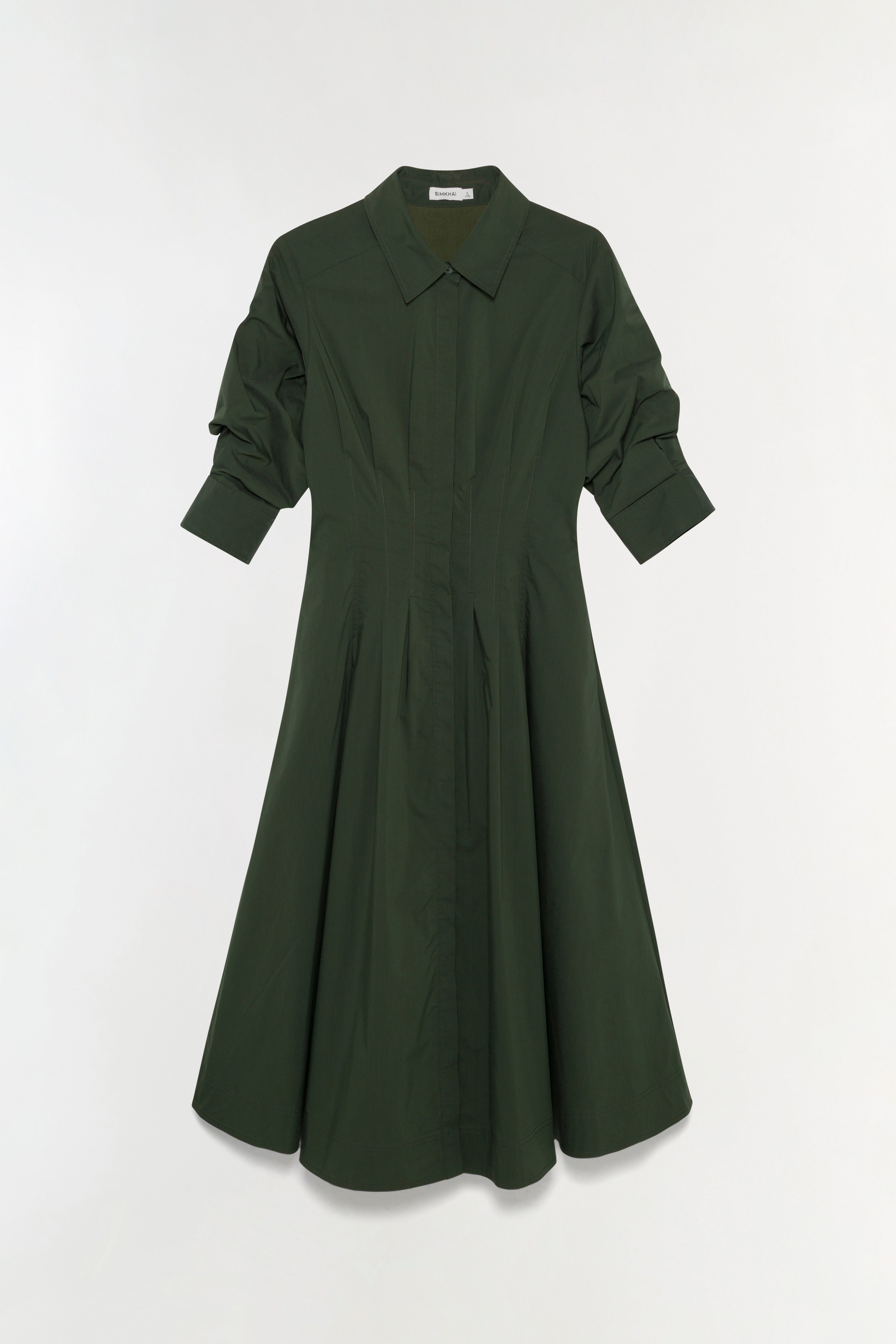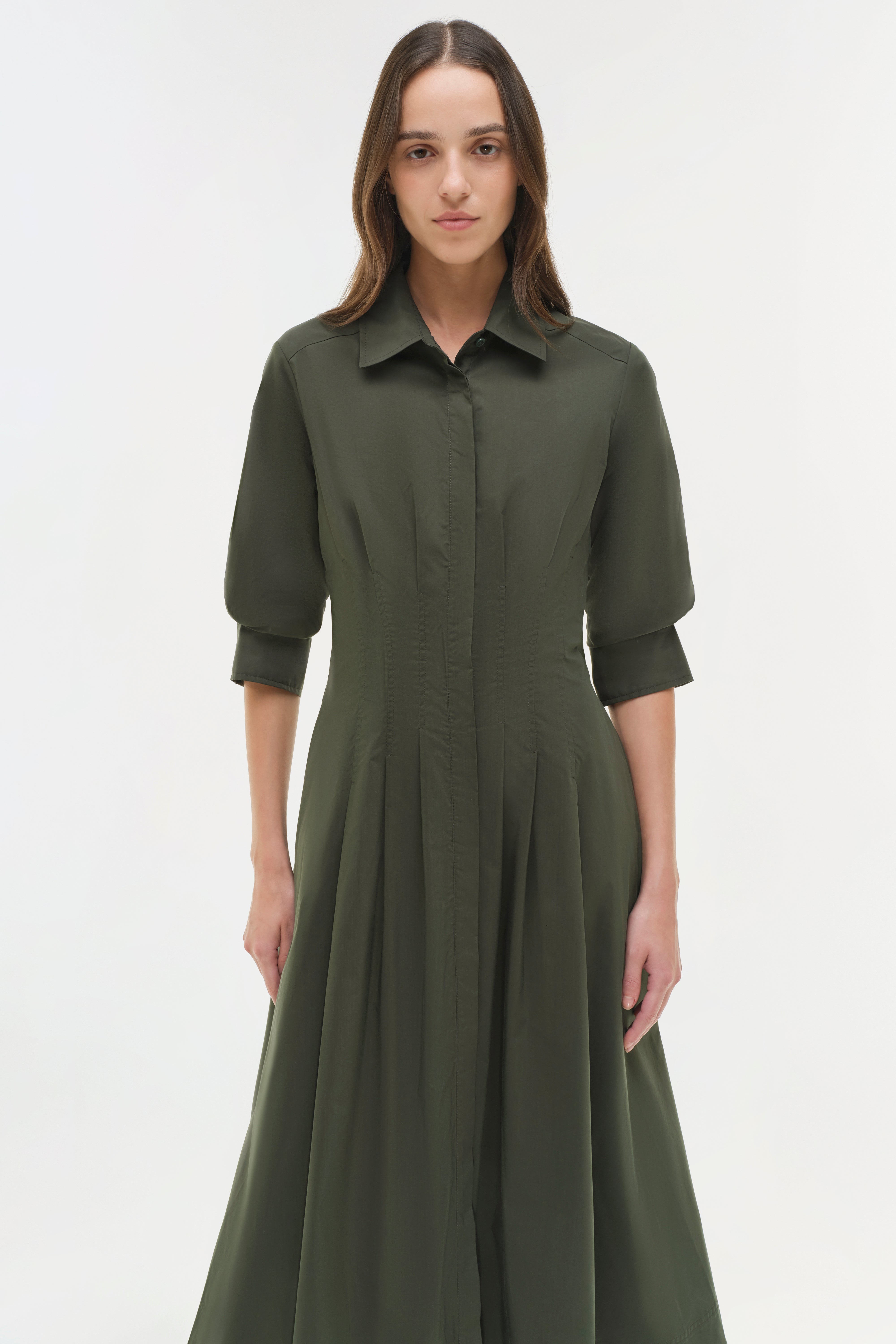 An essential upgrade to the classic shirtdress, this midi dress features the classic spread collar and button front closure with a pintucked waist and full skirt.