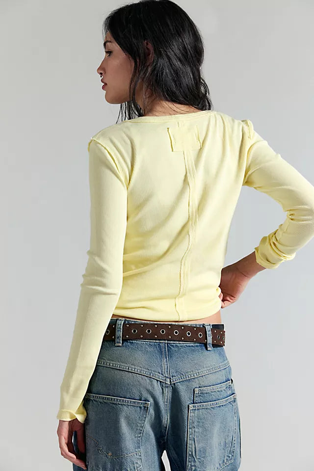 Features: Soft cotton fabrication with a stretchy feel, henley-style with button closures, fitted long-sleeves, exposed seam detailing, round hemline