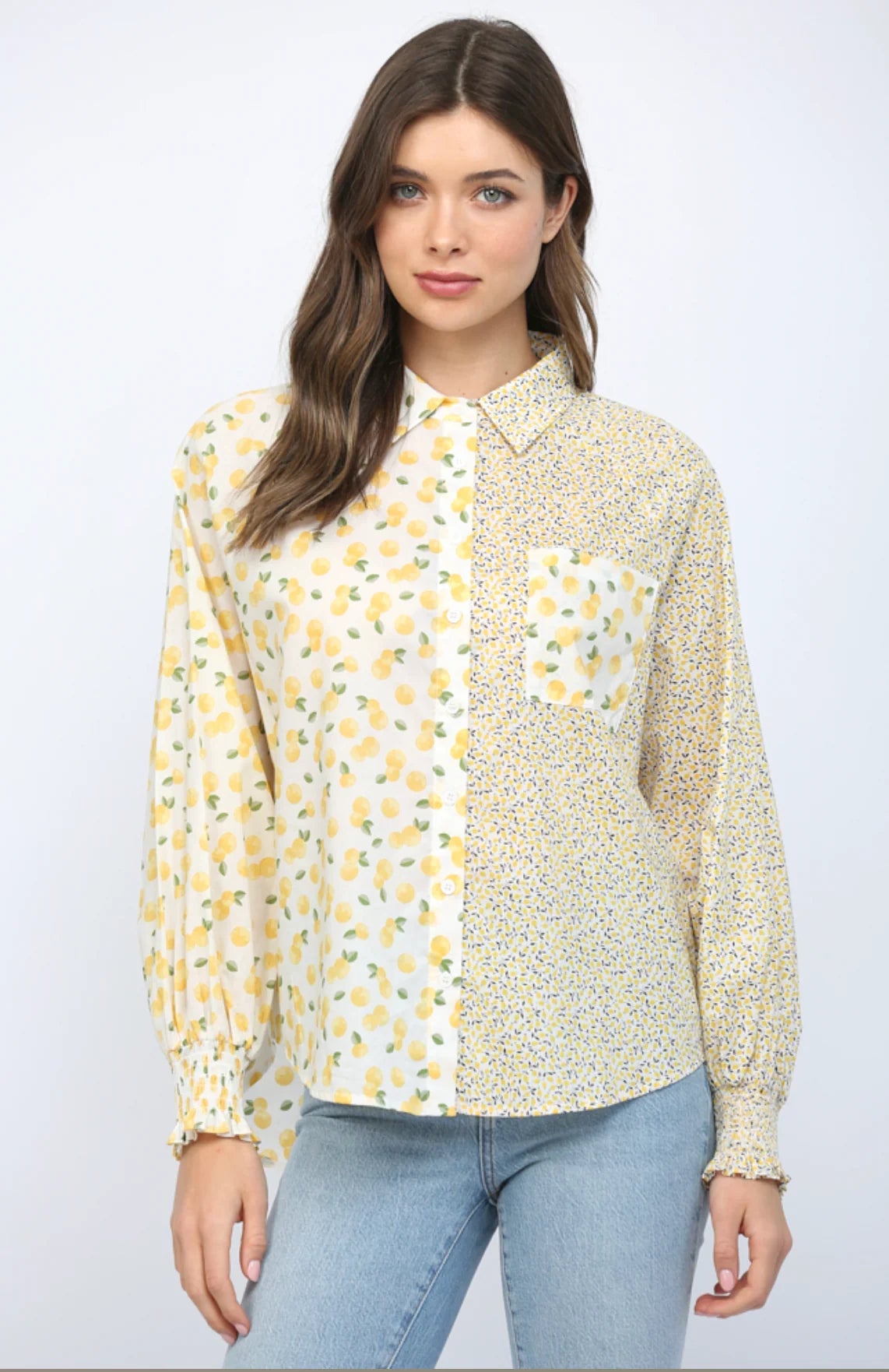 Bright, cheerful, and perfect for sunny days, this lemon print button-up shirt adds a fresh, playful touch to your wardrobe. Set on a soft ivory background, the vibrant lemon pattern brings a fun pop of color while the classic button-front design keeps the look polished and timeless. The relaxed fit and lightweight feel make it easy to wear tucked, tied, or layered. Pair it with your favorite denim or white bottoms for an effortlessly crisp, citrus-inspired look that’s perfect for everyday wear or vacation styling.