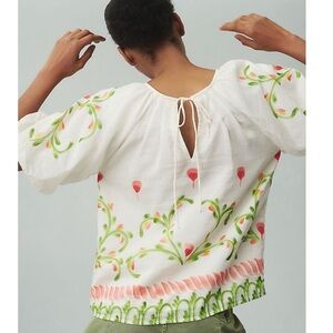 New to Banjanan, this season's hand-painted garments are each one-of-a-kind, painted with folk art motifs in Jaipur by a team of artisans on luxurious cotton-silk. The Oana top's dramatic puffy sleeves and inverted front pleats are gathered into a drawstring back keyhole.