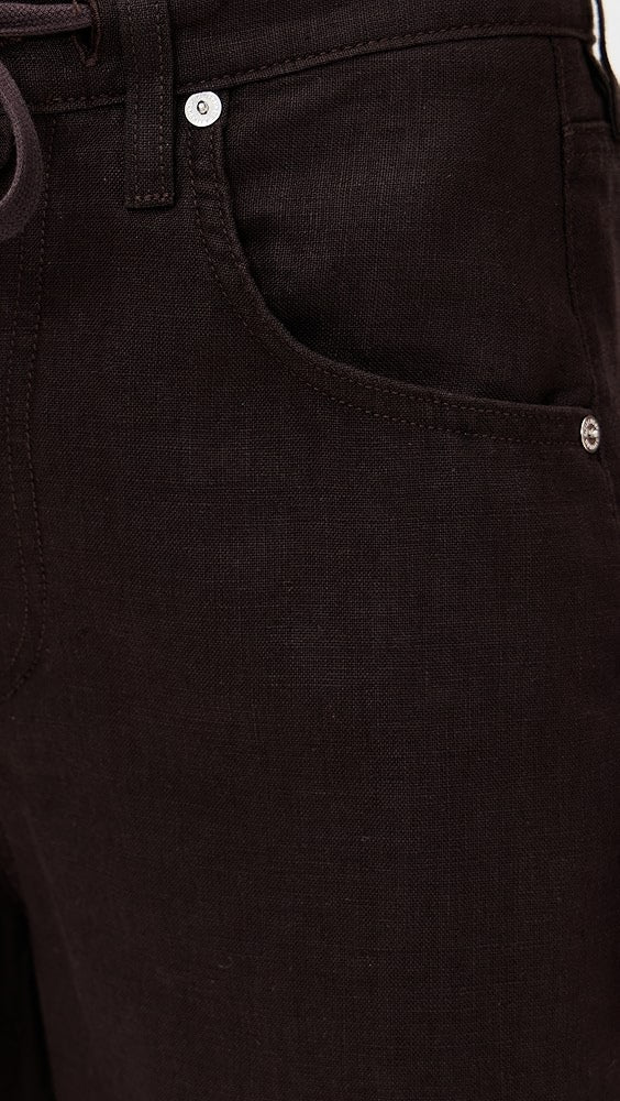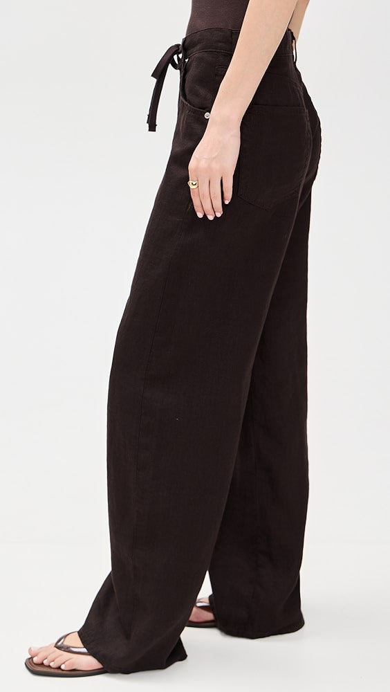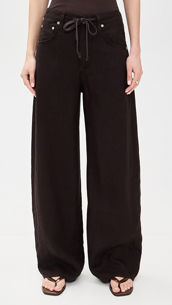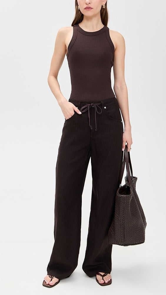 Intended for a mid-rise, wide-leg cut. The adjustable drawstring can be used to cinch the waist. Linen fabric has a breathable feel and offers no stretch.