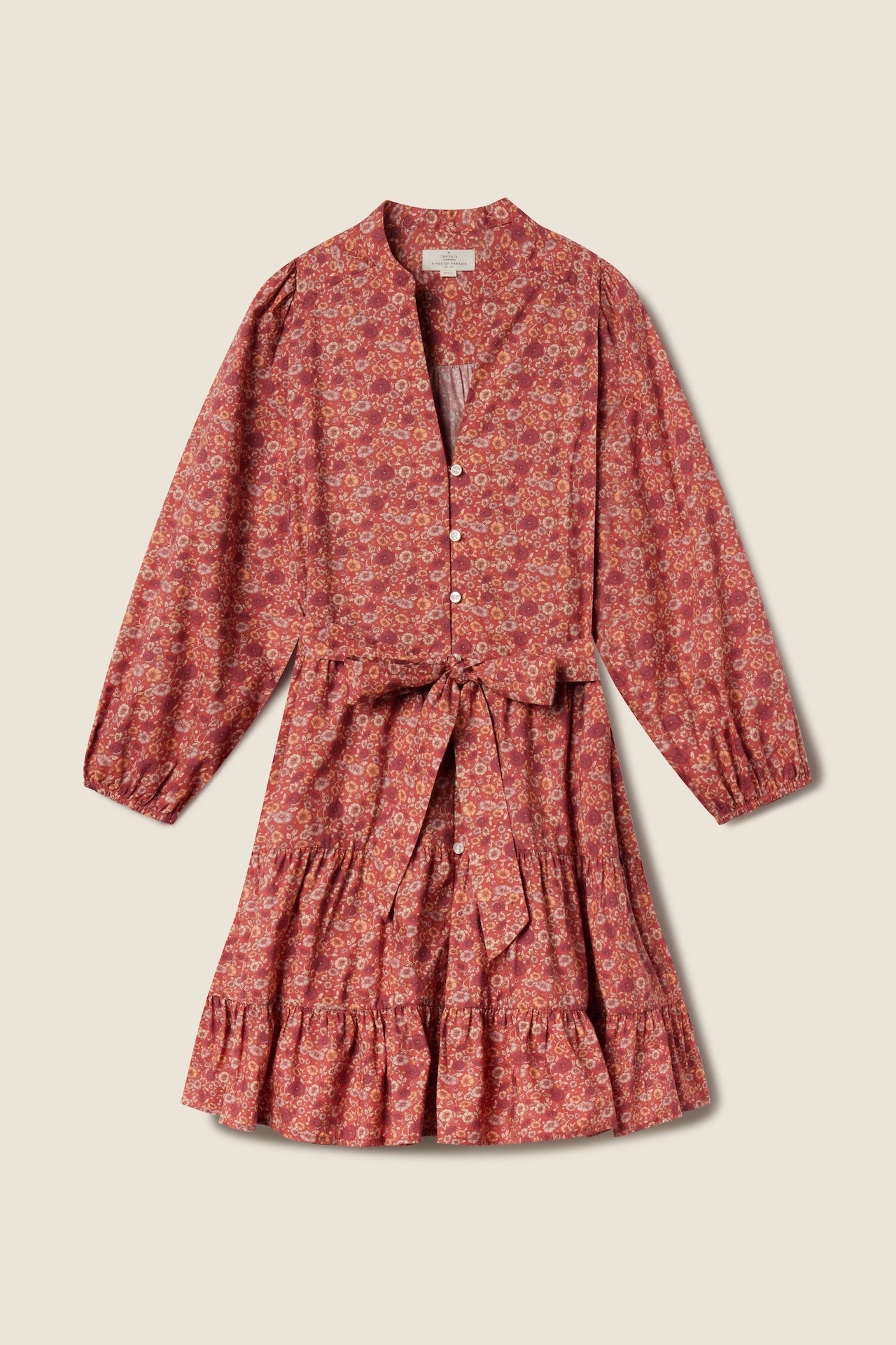 The Celeste Dress is a mini-length dress with a clean v-neck opening, full-length gathered sleeves, and two gathered skirt tiers for added movement. A removable waist sash is added alongside two rows of top stitching for added detail. Featuring our signature hidden side seam pockets. Shown here in Ethereal Vine and made from our cotton poplin.