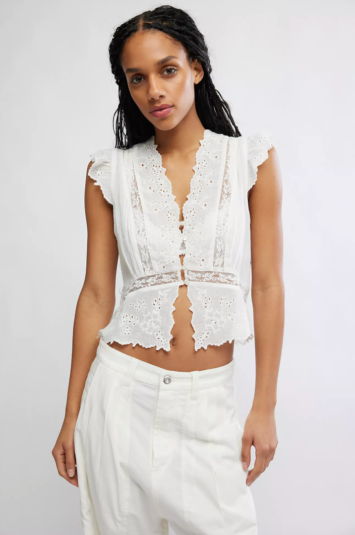 Step into a world of dreamy elegance with this ethereal top, featuring a breezy cotton fabrication, a relaxed, peplum-inspired silhouette, and embroidered details for a femme flourish.