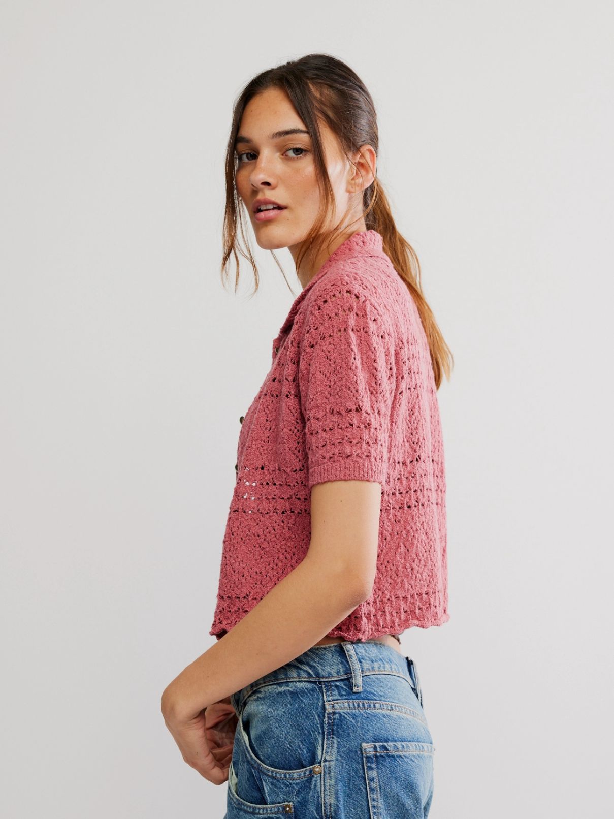 The Daylight Cardigan from Free People's Collection line offers a charming blend of cozy elegance and romantic artisan styling. Featuring a delicate crochet-inspired knit, this cropped cardigan is tailored with a collared neck, short sleeves, and a button-down front, delivering a soft, feminine layer perfect for transitional weather.