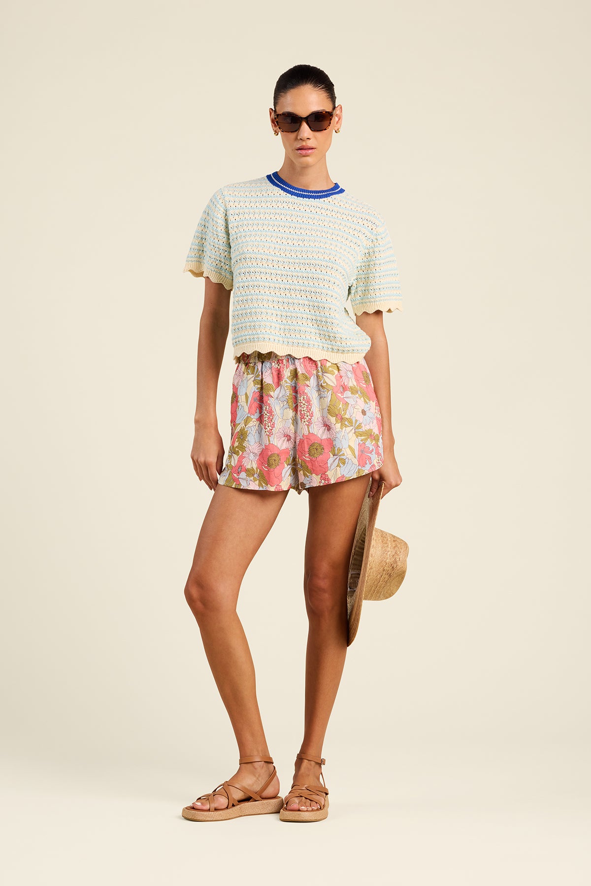 Our Jules sweater has a loose knit weave perfect for Spring days. Shown here in our Aqua Stripe. Made from our soft cotton.