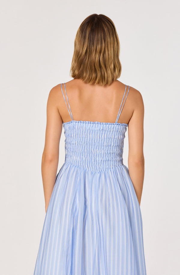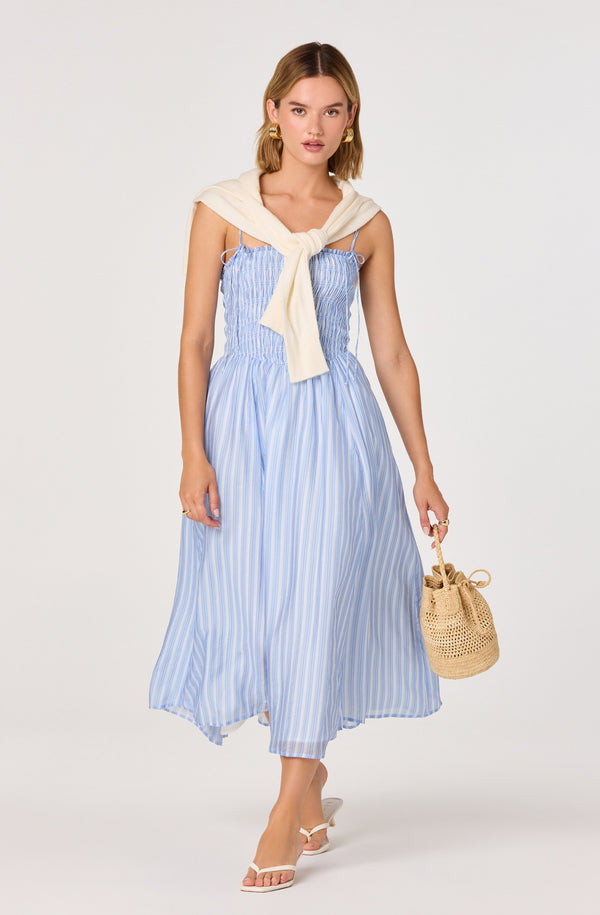 A smocked bodice makes this midi dress the ultimate in easy, breezy style. The adjustable double tie straps and all-around ruffle trim add sweet details, while the organza-lined skirt creates beautiful movement.