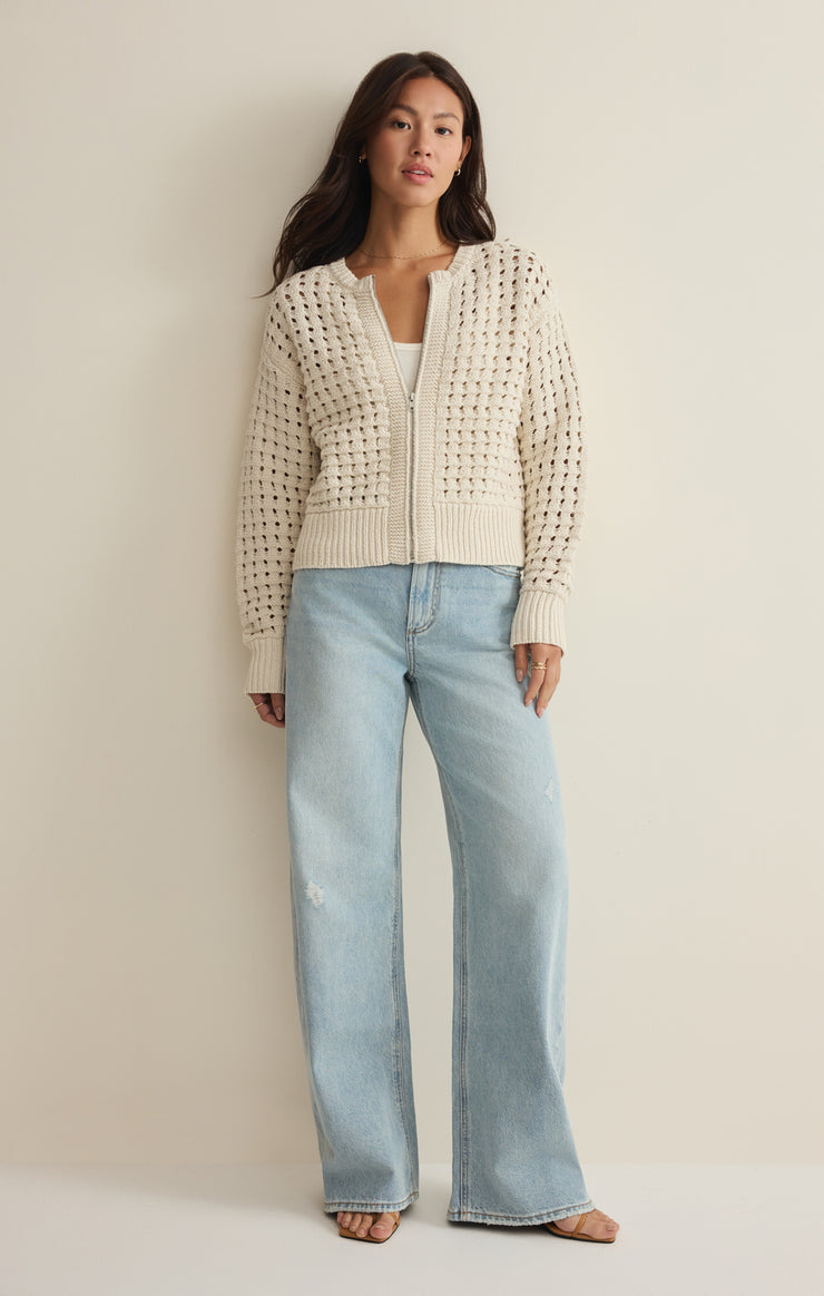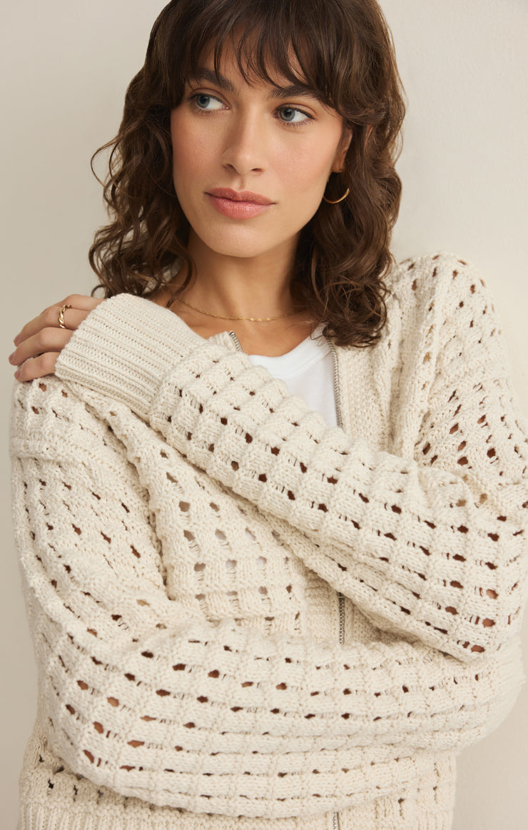 Crafted from soft cotton-blend yarns, this sweater jacket features a novelty knit texture that adds depth and dimension. With ribbed trims, a crew neckline, and an exposed zipper, it’s the perfect piece for transitional layering and all-day comfort.