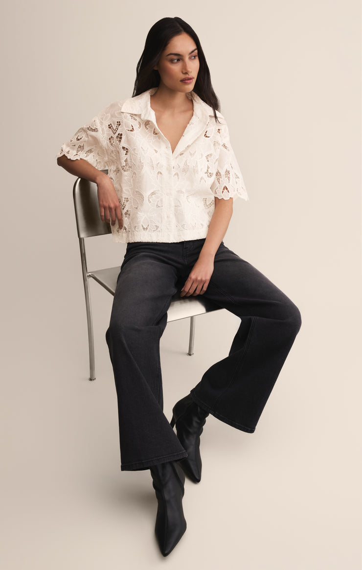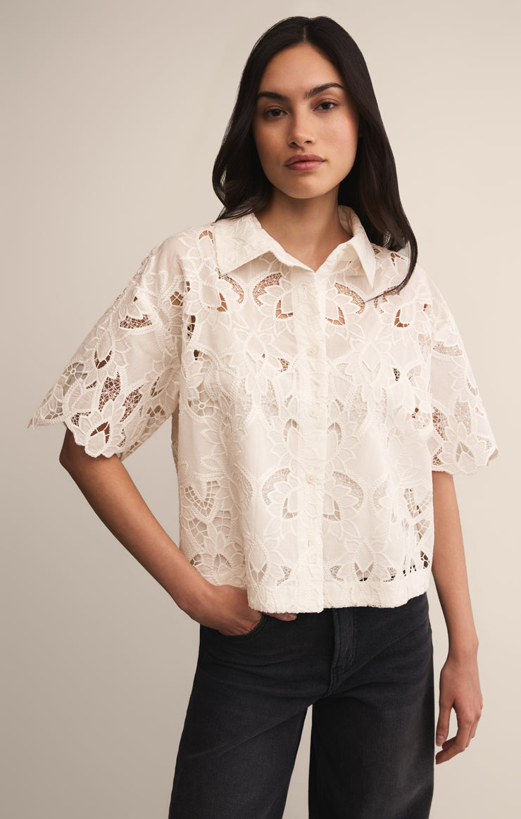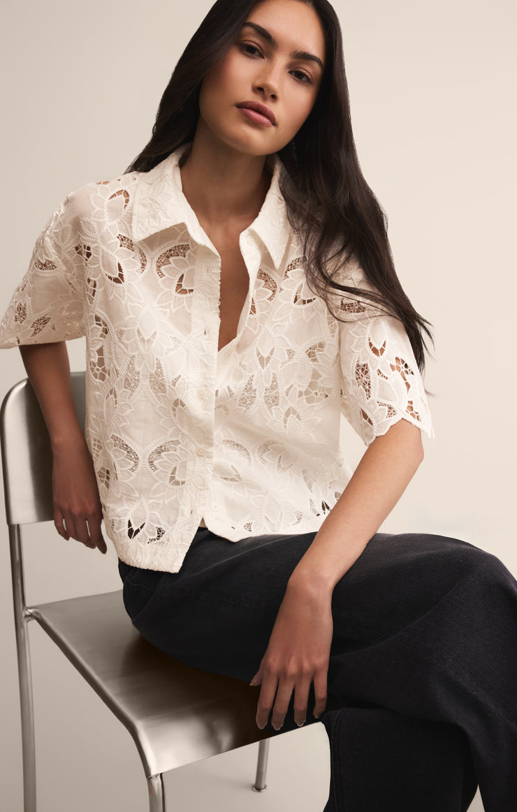 Intricate embroidery and an airy feel make this button-up an easy way to dress up your look. Delicate embroidery meets breezy cotton crepe in this short-sleeve button-up. The collared silhouette and airy fabric make it a polished yet easy layer for day-to-night styling.