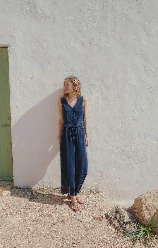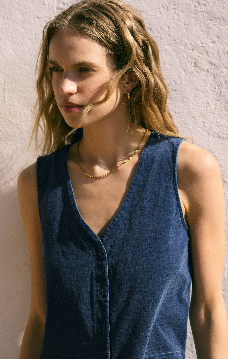 A vintage-inspired take on denim, this knit top has a relaxed fit and an easy button-front design. The soft cotton jersey knit denim drapes beautifully, with wide straps that make it effortlessly bra-friendly.